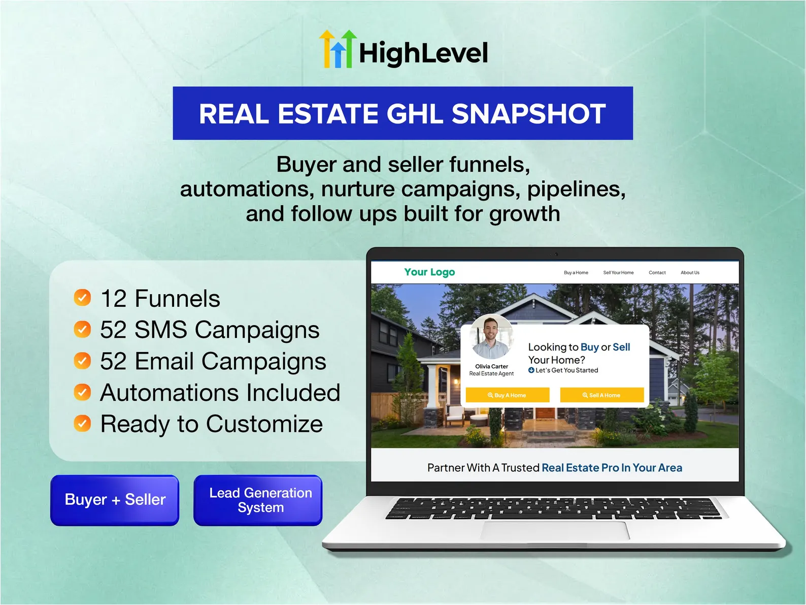 Real Estate GoHighLevel Snapshot | GHL Realtor CRM | Website, Buyer Seller Funnels, Automations, Nurture | Done For You